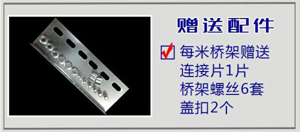 贈(zèng)送配件,每米槽式橋架贈(zèng)送連接片1片,橋架螺絲6套,蓋扣2個(gè)