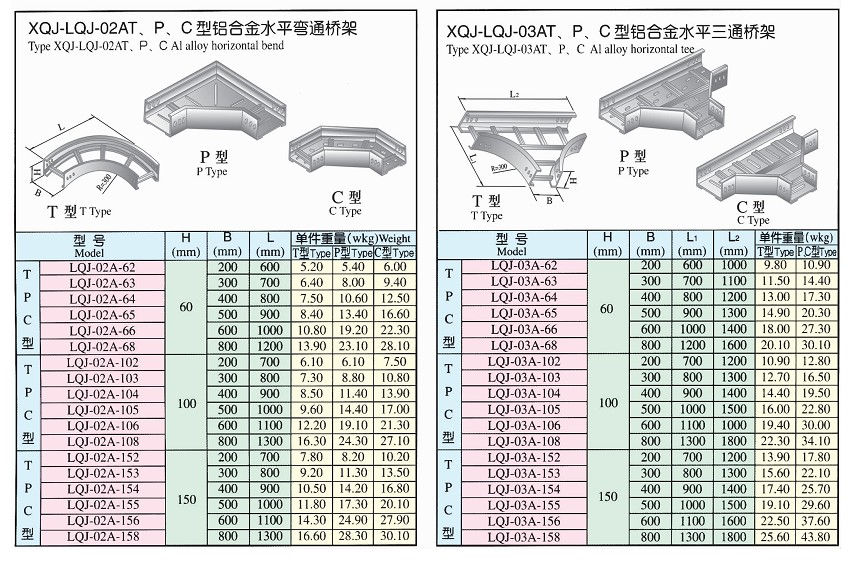 鋁合金水平彎通和三通橋架型號表