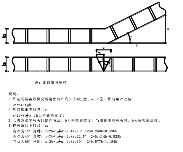 3. 上圖為水平彎頭的制作方法,b位橋架寬度;當(dāng)制作垂直彎頭時(shí),b位橋架的高度;